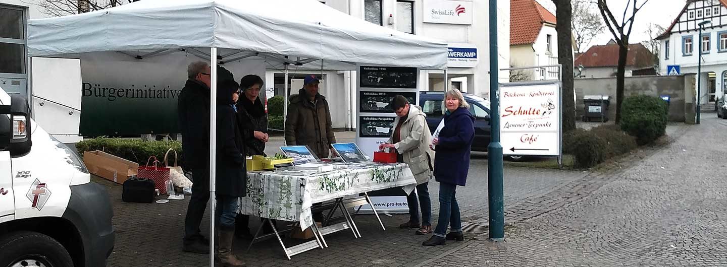 Zwischen Brot und Fleisch informierte Pro Teuto am 04.03.2017 an der Hauptstraße in Lienen über den Sachlichen Teilplan Kalk. Neben den persönlichen Einschätzungen der BI-Mitglieder konnten auch gleich Einwendungsformulare für die bis zum 24.03.2017 mögliche Bürgerbeteiligung mitgenommen werden.
